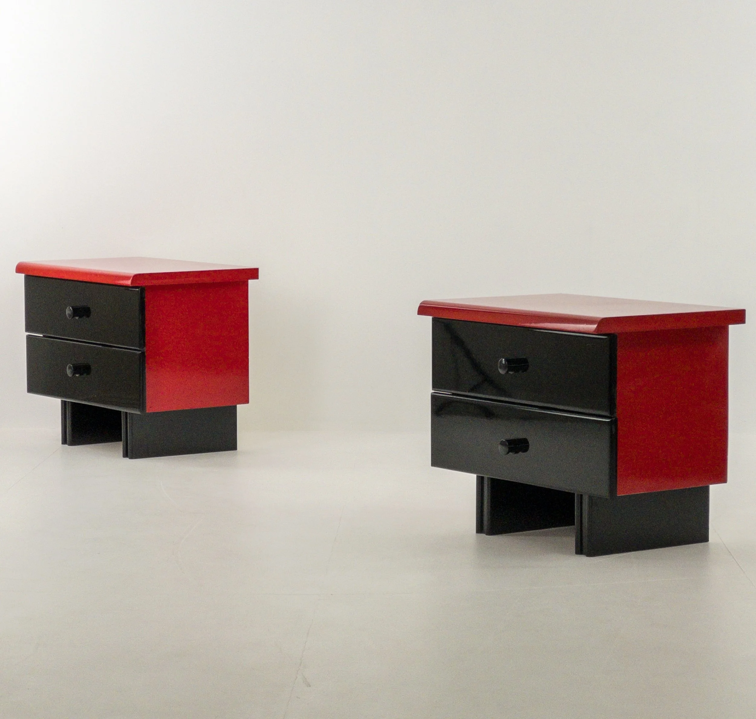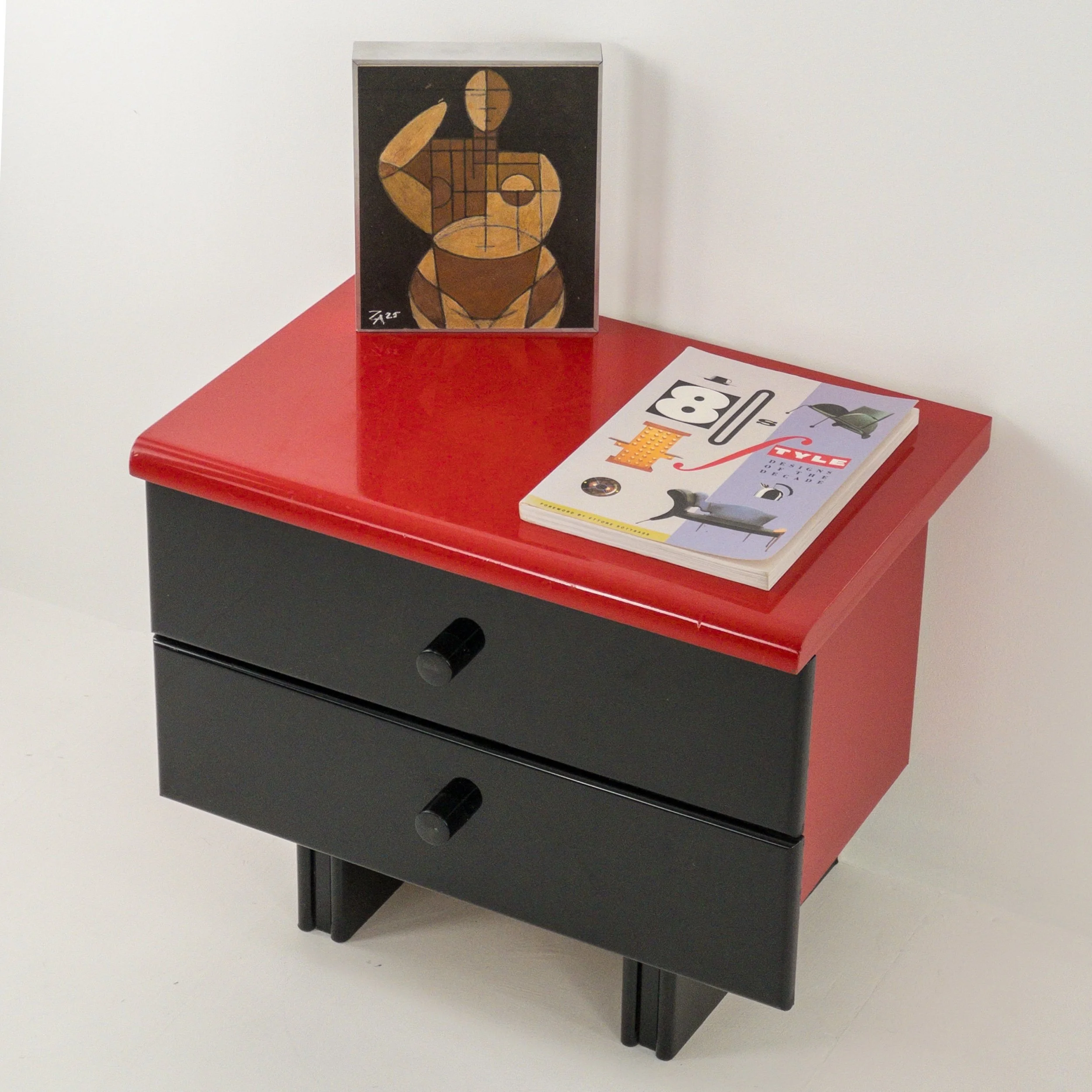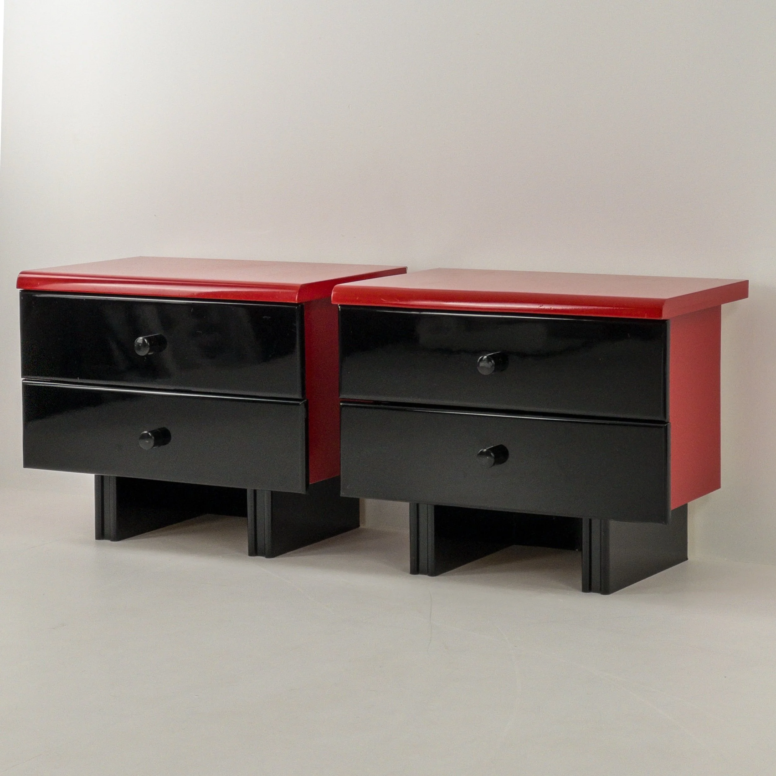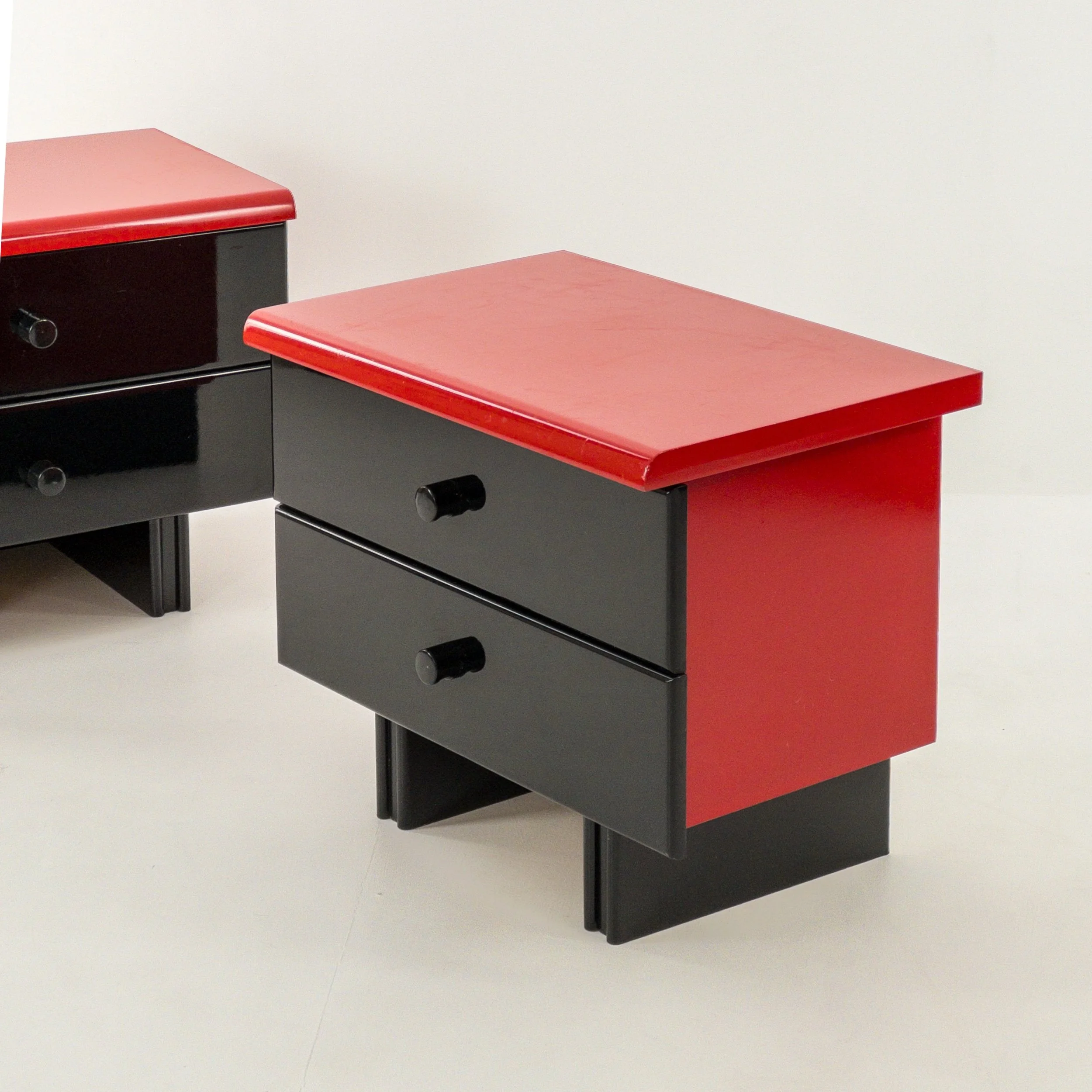 1980’s Memphis Vibes Bedsides! Get your groove on with these playful yet classy additions to your bedroom. Can be styled in multiple ways to achieve some great looks with the functionality of both the lacquer tops and the full drawers per table. Patina commensurate with age but in great condition for being approximately forty years old!