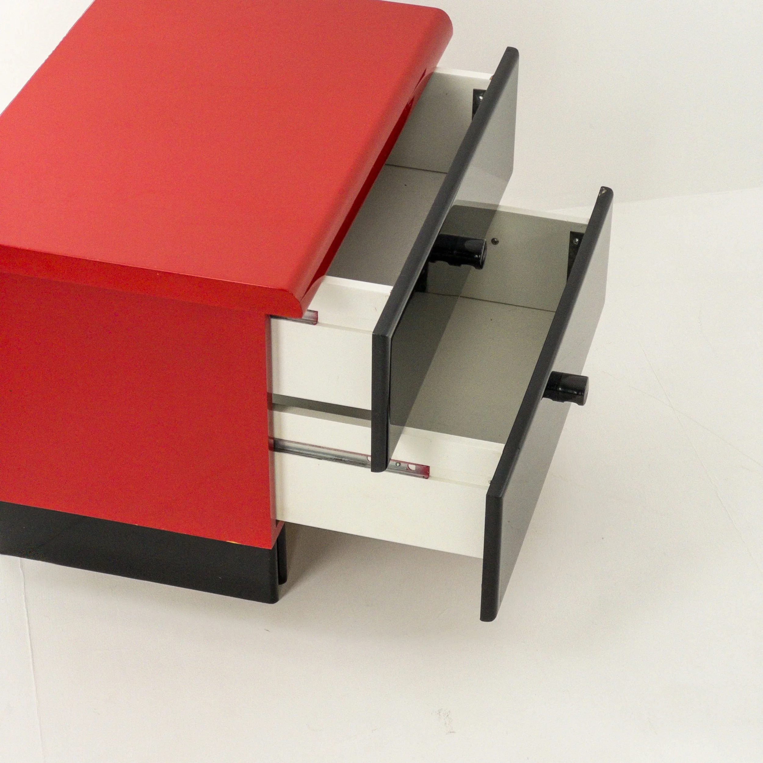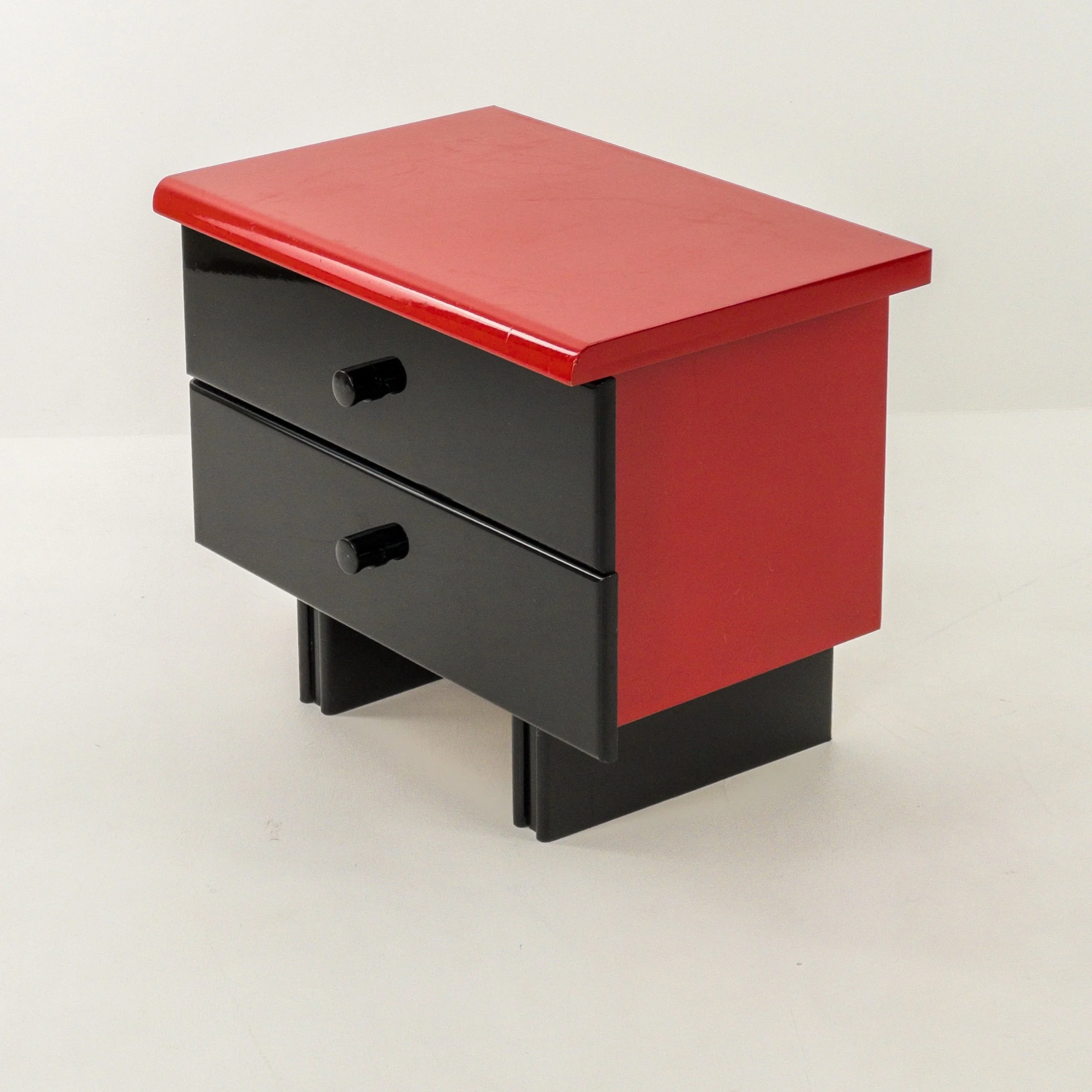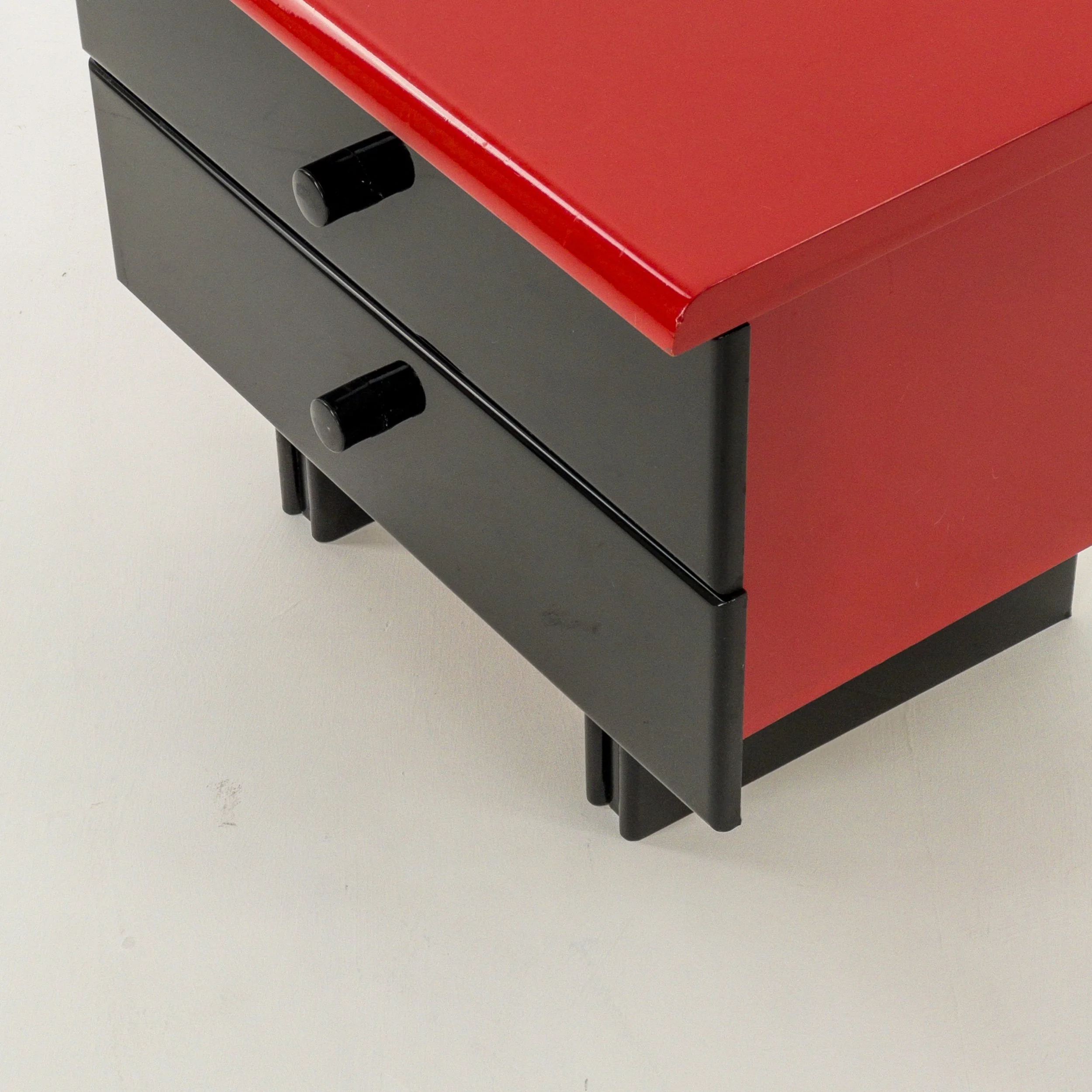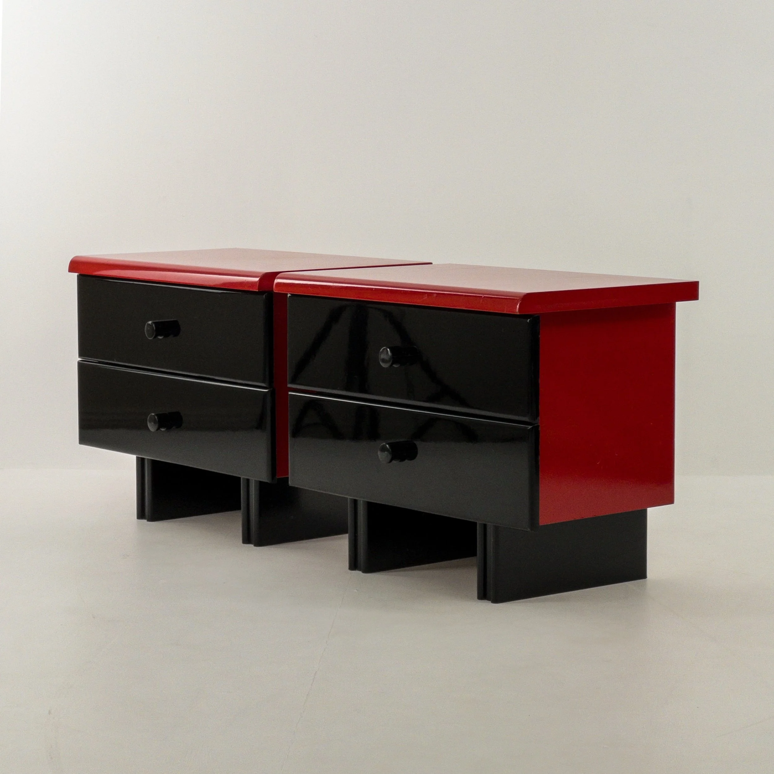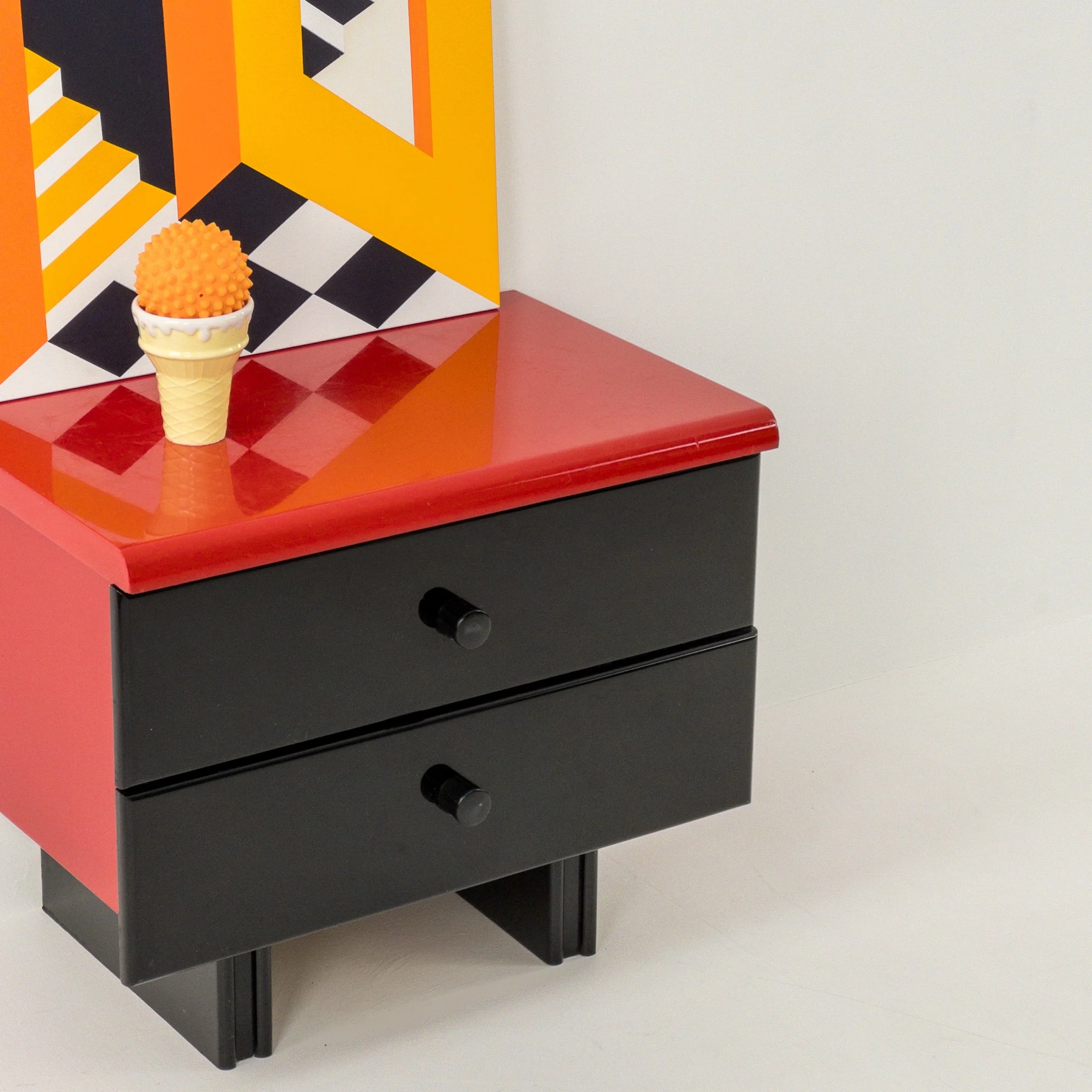 1980’s Memphis Vibes Bedsides! Get your groove on with these playful yet classy additions to your bedroom. Can be styled in multiple ways to achieve some great looks with the functionality of both the lacquer tops and the full drawers per table. Patina commensurate with age but in great condition for being approximately forty years old!