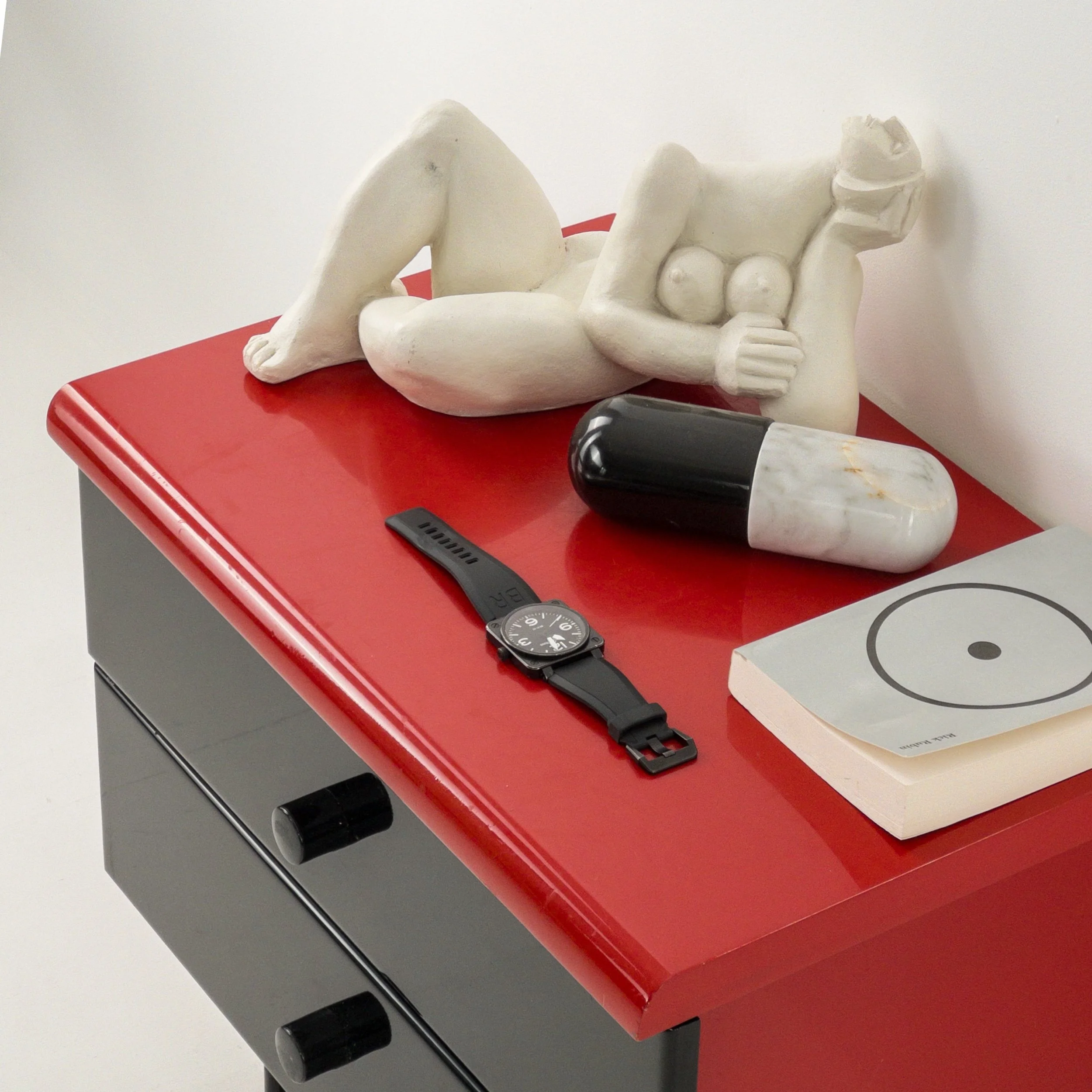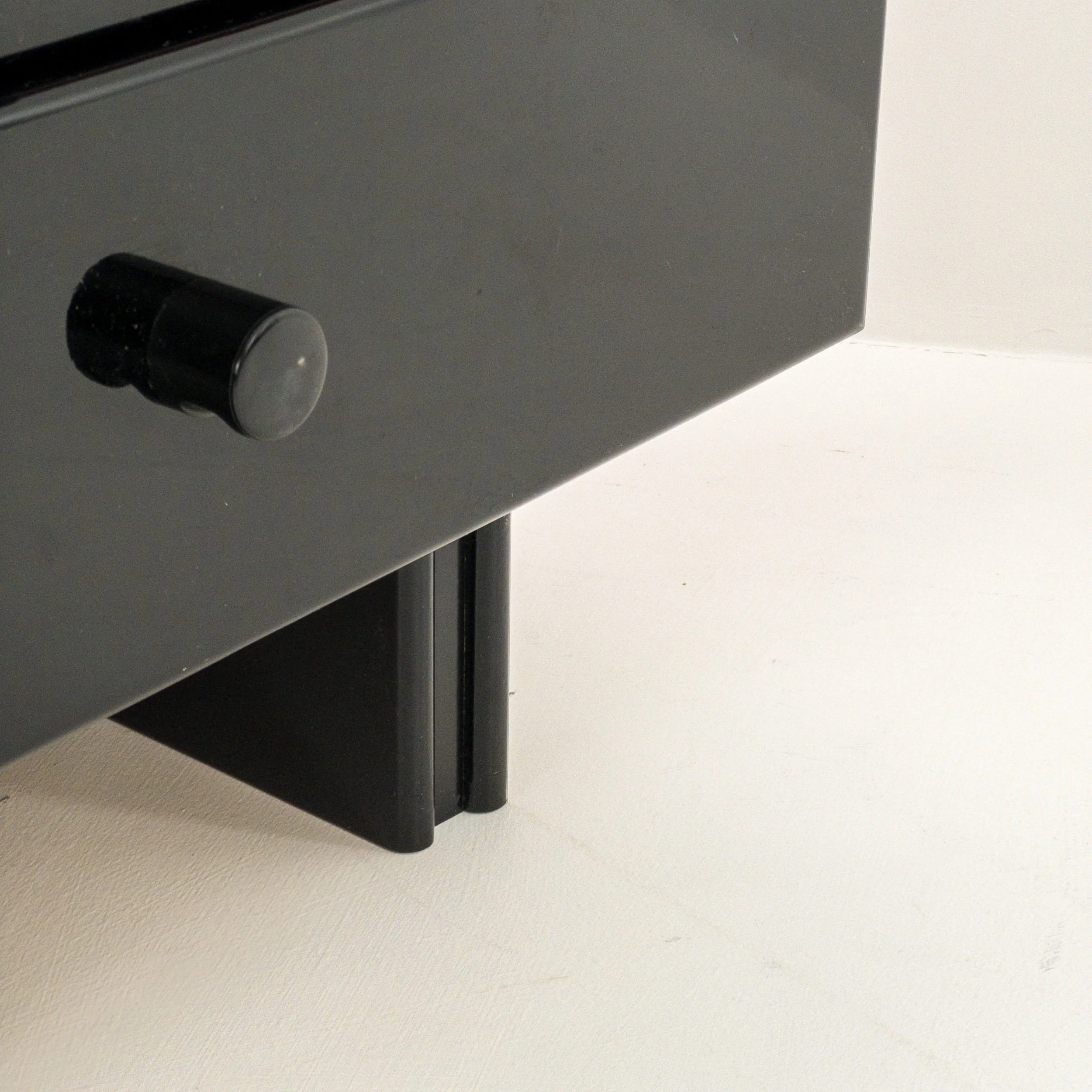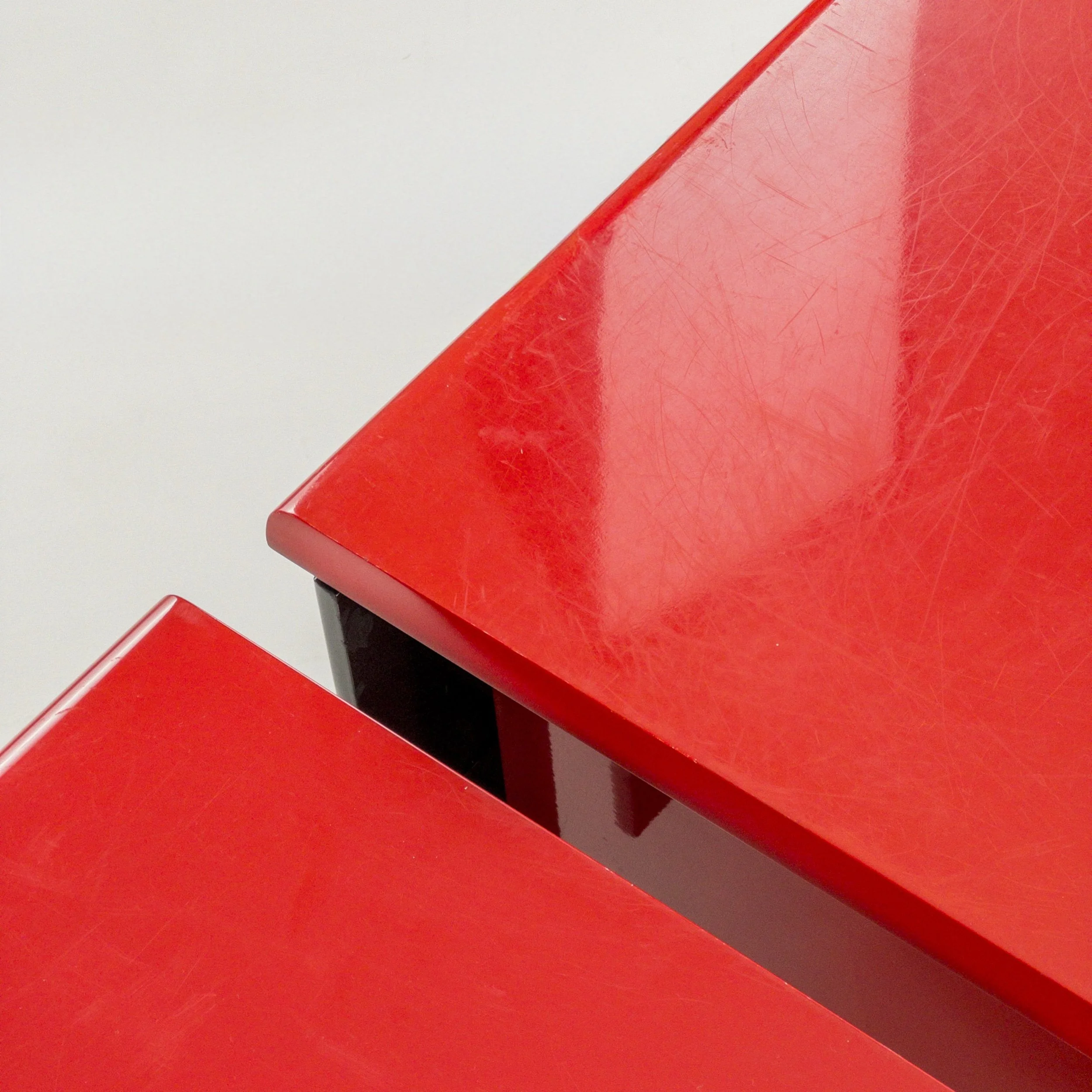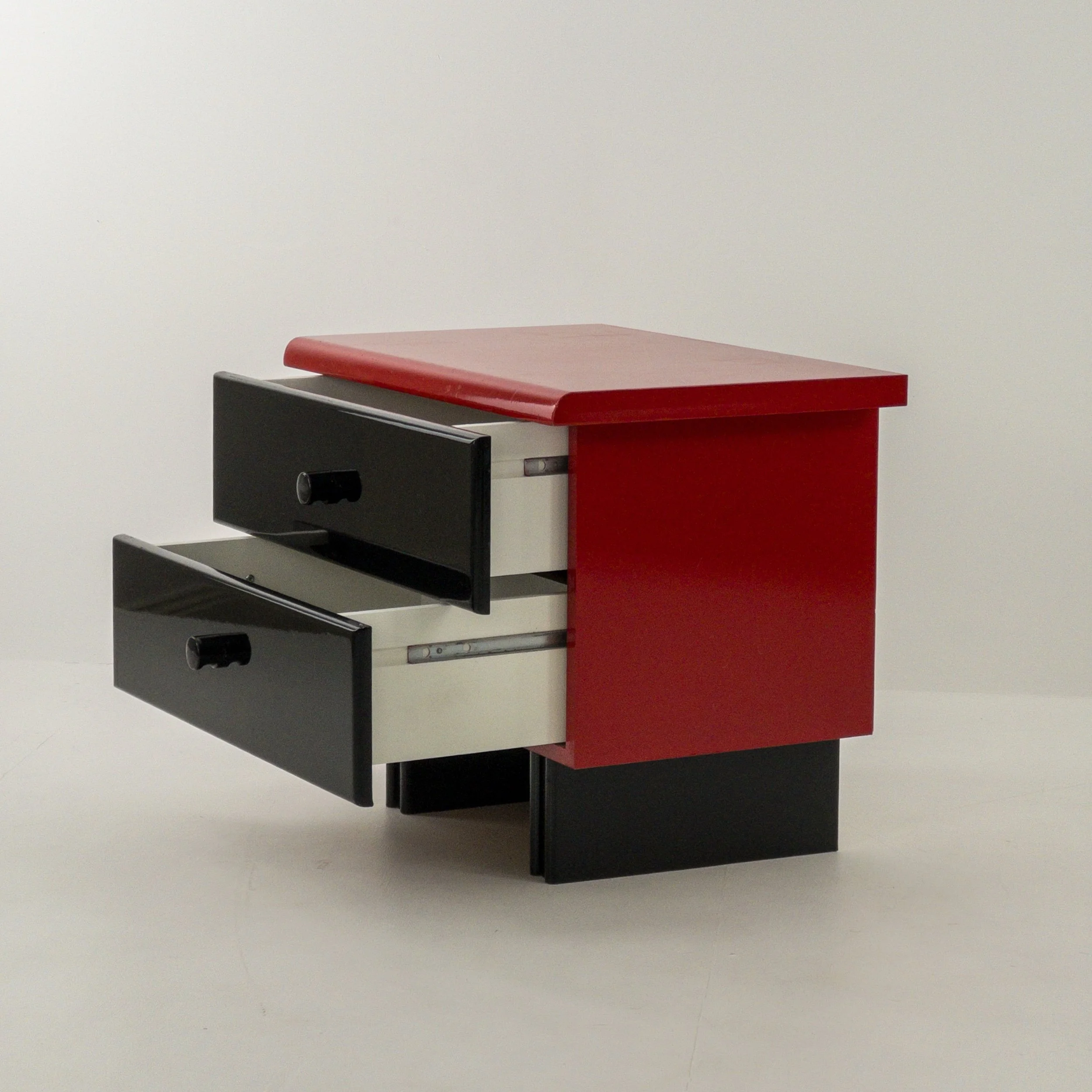 1980’s Memphis Vibes Bedsides! Get your groove on with these playful yet classy additions to your bedroom. Can be styled in multiple ways to achieve some great looks with the functionality of both the lacquer tops and the full drawers per table. Patina commensurate with age but in great condition for being approximately forty years old!